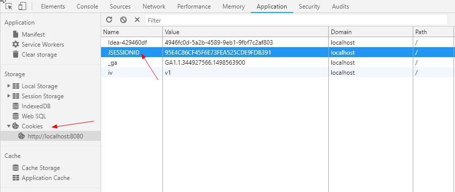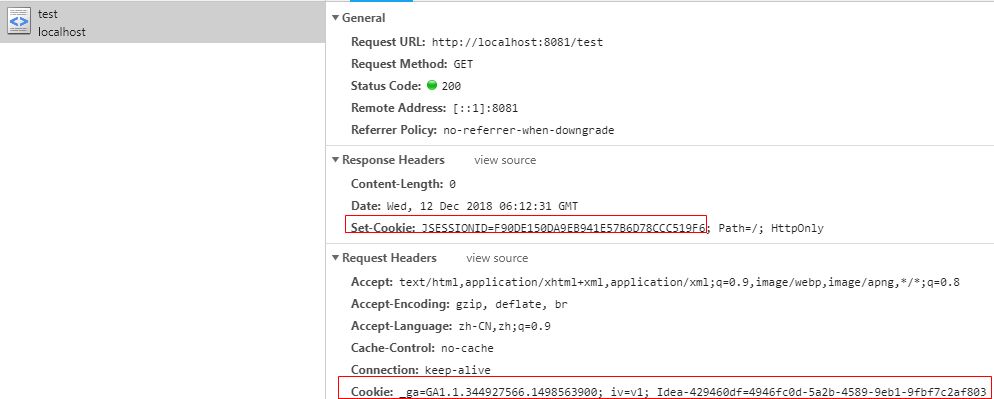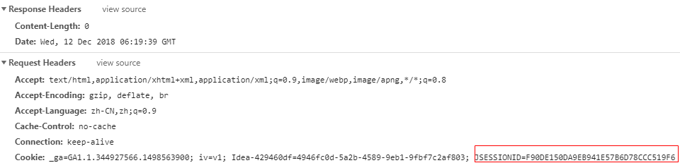 请求头中,包含的Cookie信息,并没有上文提到的jsessionid, 那是因为这是对系统的初次访问,系统还没生成session。但是访问之后,系统就会生成一个session,而且,会在响应流中设置响应头Set-Cookie,其值为JESSIONID=xxx。这样浏览器对localhost:8080和cookie的联系就有了记忆,浏览器会将其存储起来,可在调试工具中看到: