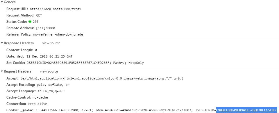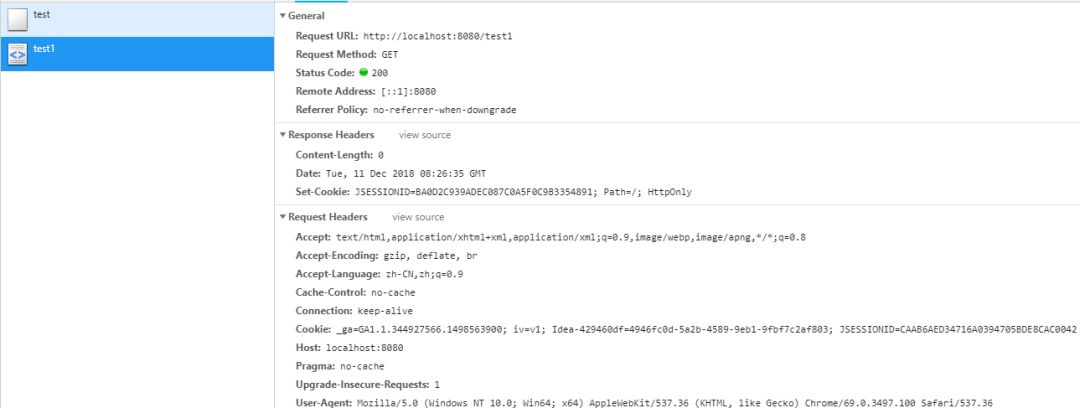那么再次访问http://localhost:8080/test1, 浏览器会主动在请求头添加包括jsession的cookie信息