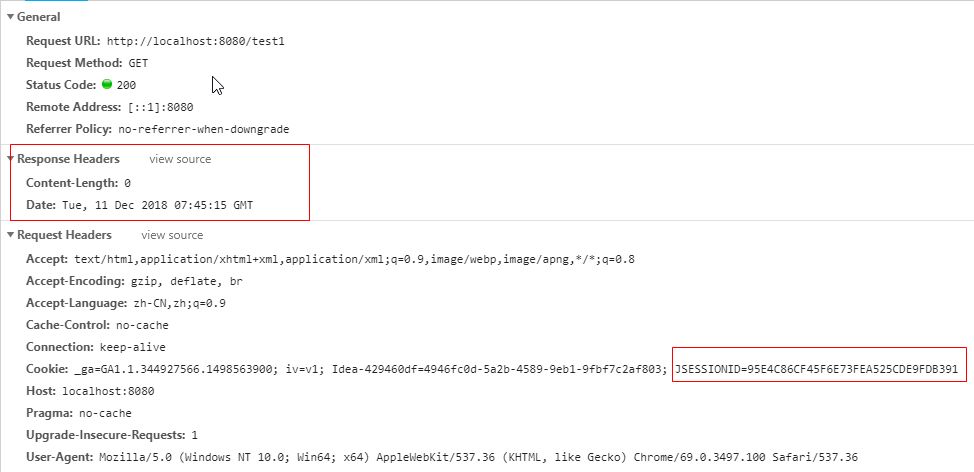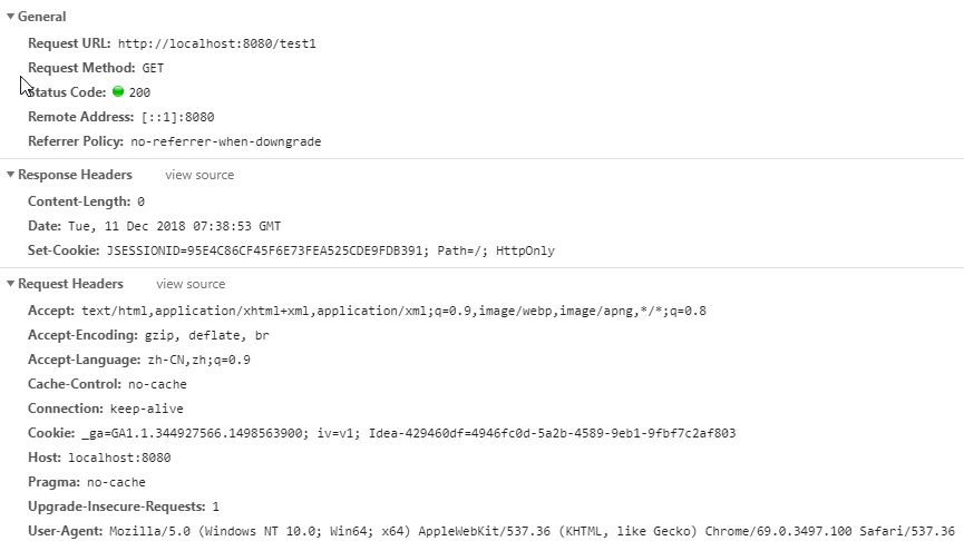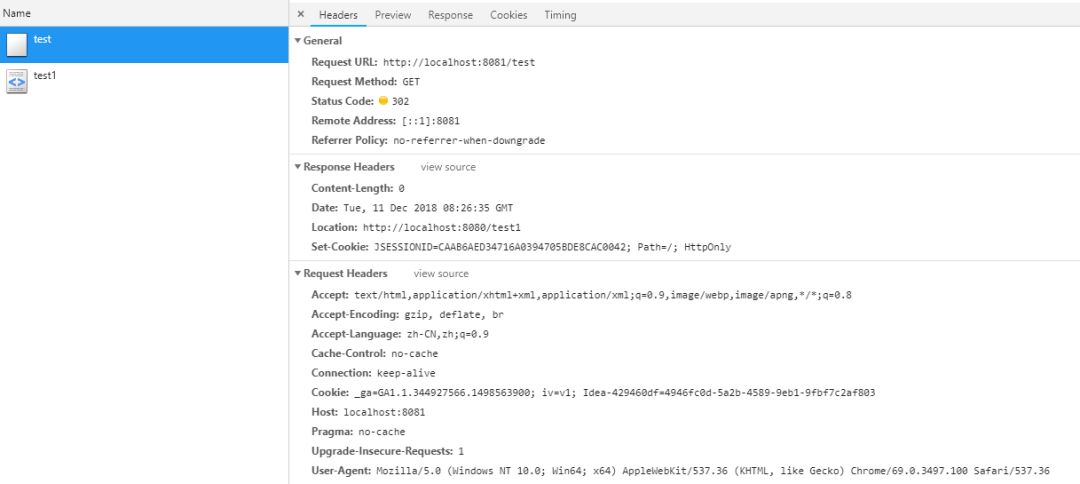 这是一次http请求中(http://localhost:8080/test1),包含的请求和响应信息,是对一个系统的初次访问,用的是谷歌浏览器。