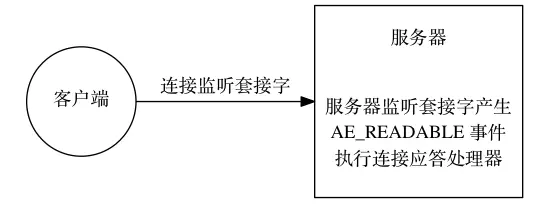 当Redis服务器进行初始化的时候,程序会将这个连接应答处理器和服务器监听套接字的AE_READABLE事件关联起来,当有客户端用sys/socket.h/connect函数连接服务器监听套接字的时候, 套接字就会产生AE_READABLE 事件, 引发连接应答处理器执行, 并执行相应的套接字应答操作,如图所示。