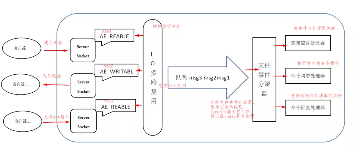 尽管多个文件事件可能会并发地出现,但I/O多路复用程序总是会将所有产生事件的套接字都推到一个队列里面,然后通过这个队列,以有序(sequentially)、同步(synchronously)、每次一个套接字的方式向文件事件分派器传送套接字:当上一个套接字产生的事件被处理完毕之后(该套接字为事件所关联的事件处理器执行完毕), I/O多路复用程序才会继续向文件事件分派器传送下一个套接字。