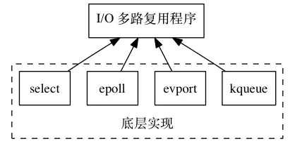 因为Redis为每个I/O多路复用函数库都实现了相同的API,所以I/O多路复用程序的底层实现是可以互换的,如下图所示。