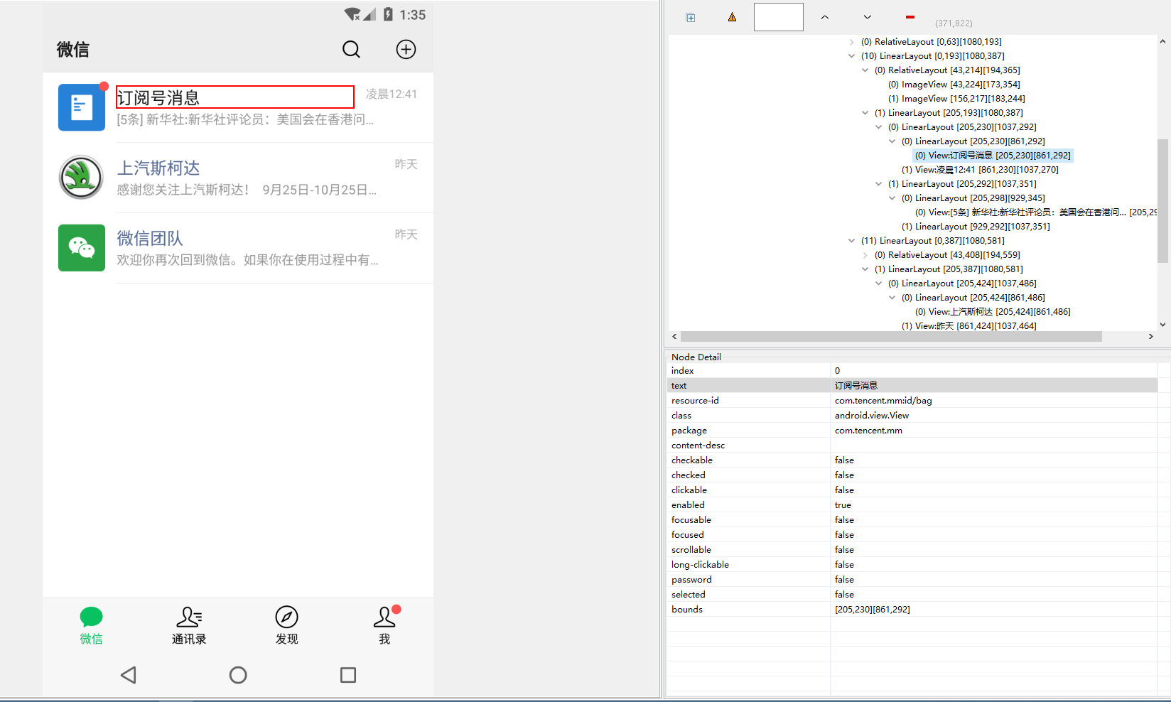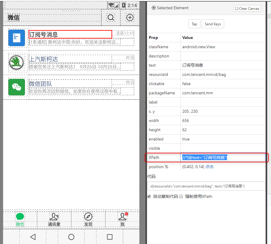 同样定位“订阅号消息”,uiautomator2给出了xpath