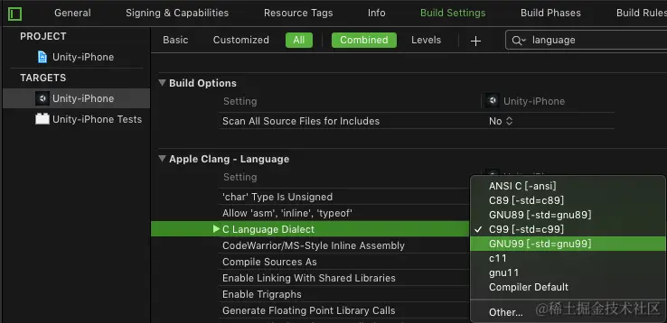 Apple LLVM 6.1 - Language设置C Language Dialect为Compiler Default或者GNU99[-std=gnu99]