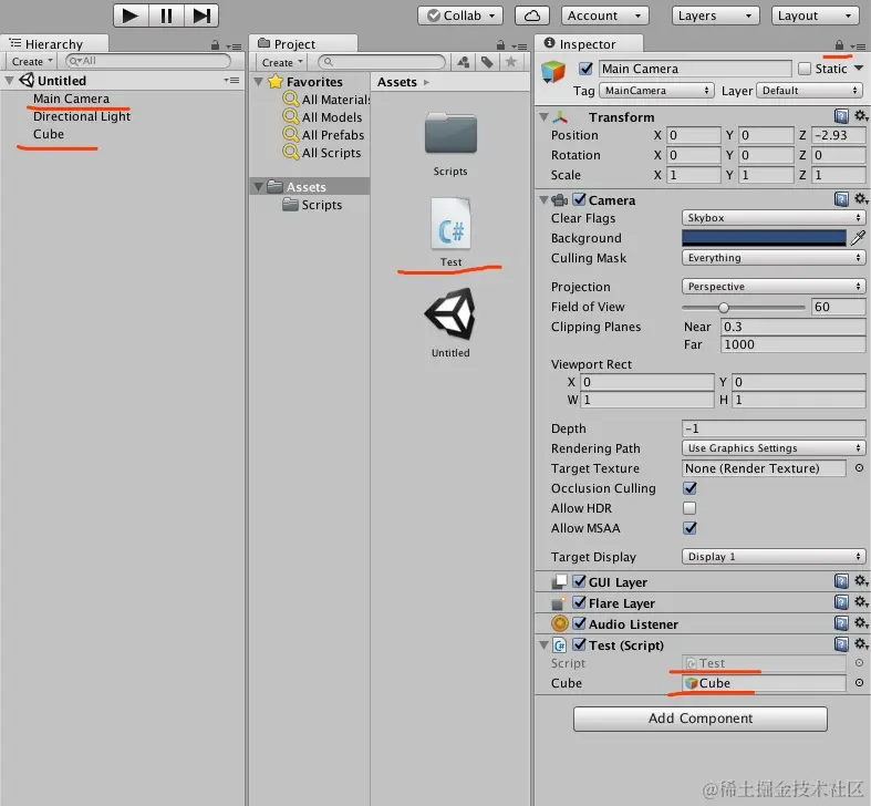 1、在Unity中: C#脚本Test和控件Cube要建立好绑定关系,不然无效.