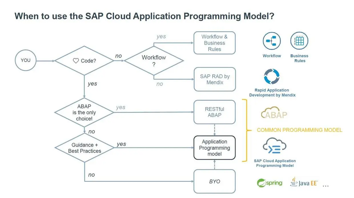 上图右边的分支表明,如果不想抛弃已经习得的ABAP开发技能,可以选择SAP云平台上的ABAP编程环境;反之,如果青睐nodejs,Java这些技术栈,那么SAP云平台也不会让你失望:SAP Cloud Application Programming Model(简称为CAP),是SAP推荐的在SAP Cloud Platform上进行开发的最佳实践。