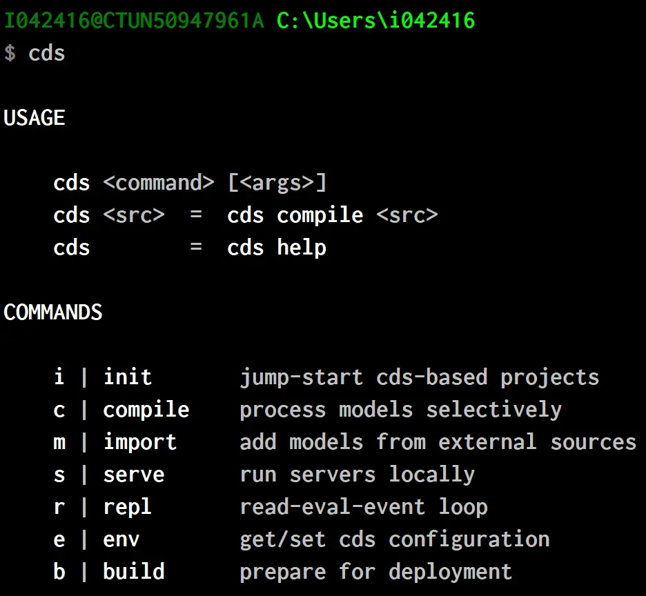 接下来直接敲cds命令,如果看到下面的帮助信息,说明安装成功了。此后所有的CAP开发,都围绕着这个cds命令进行。