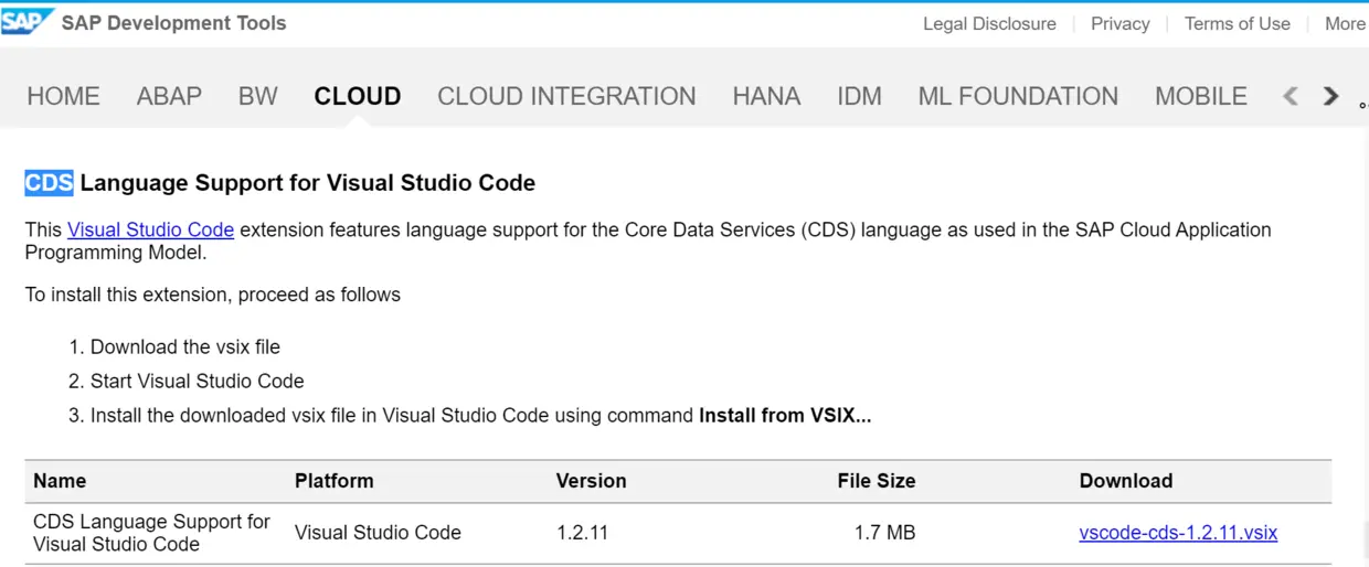 CAP开发的IDE可以使用Visual Studio Code,当然也可以用其他文本编辑工具。推荐Visual Studio Code的原因是SAP发布了一款针对CAP开发的Visual Studio Code扩展,支持语法高亮和静态检查,可以从SAP官网下载: tools.hana.ondemand.com/#cloud