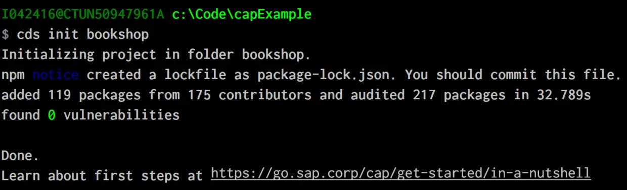 和我们开发一个nodejs应用类似,基于CAP的编程,第一步就是cds init,这个命令会自动帮我们创建CAP应用的骨架和从npm.sap.com下载CAP应用必需的库文件。