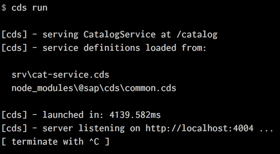 定义完之后,执行命令cds run,就可以本地预览我们刚刚创建的模型了。这个命令启动了一个本地服务器,通过http://localhost:4004访问: