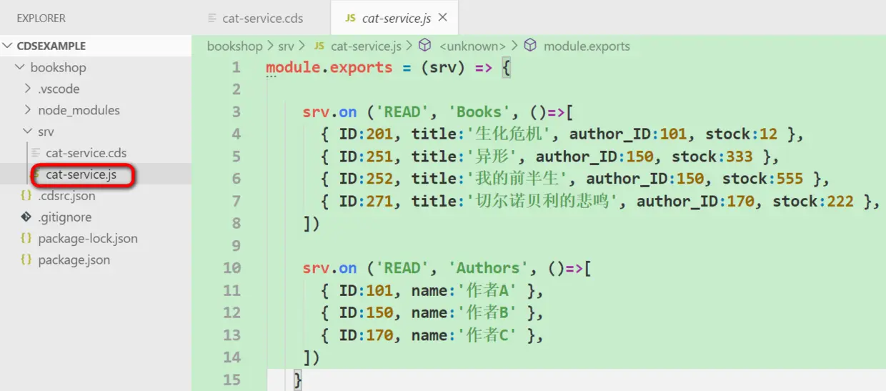 新建srv文件夹,下面创建文件cat-service.cds,完成Books,Authors和Orders的建模,即定义每个模型的字段,以及模型间的跳转关系: