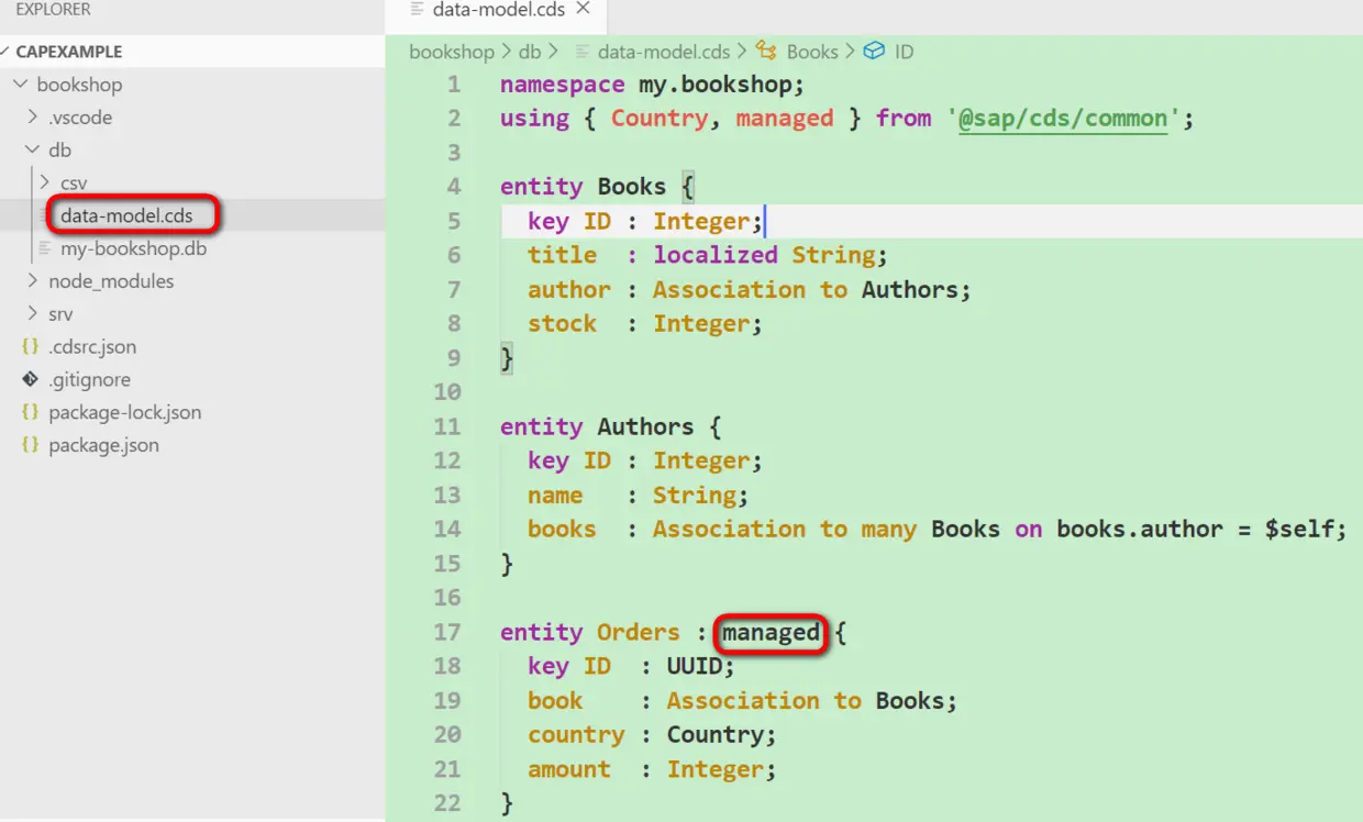 下面我们进行持久层的相关开发。新建一个文件夹db,下面新建一个文件data-model.cds,把之前实现在cat-service.cds里的模型定义拷贝过来。第17行的managed意思是把Orders模型的增删改查操作托管给框架完成。
