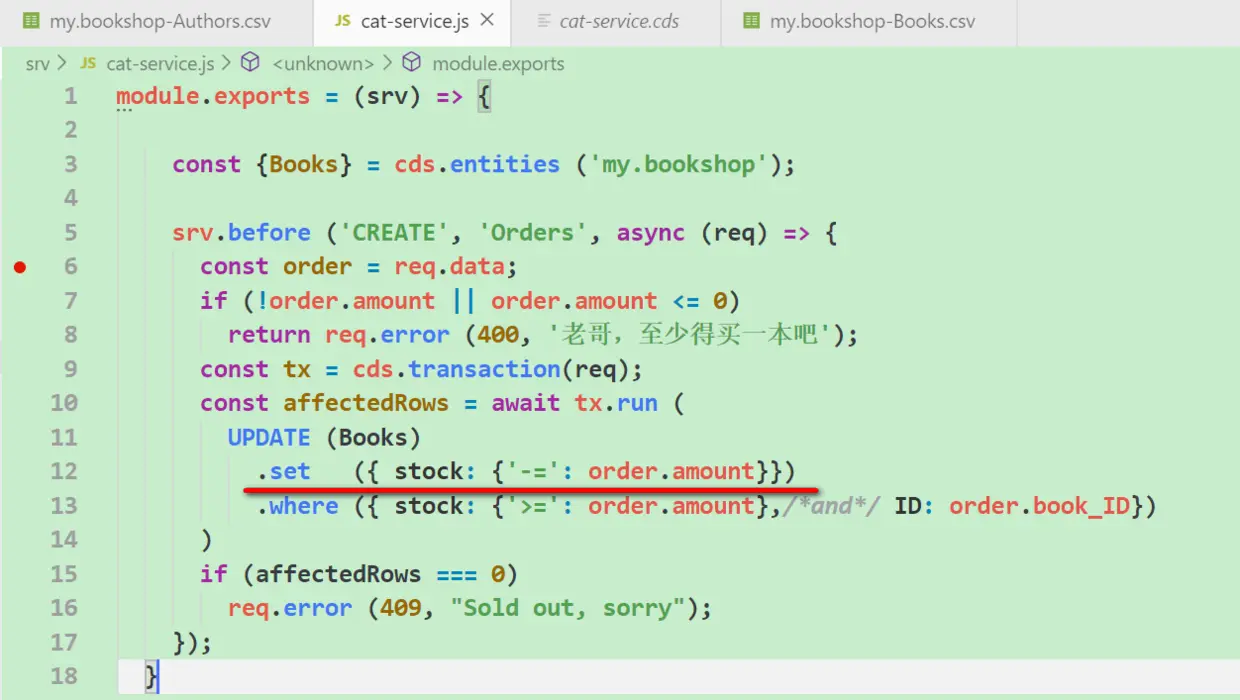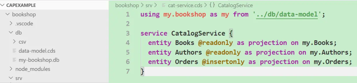 此时cat-service.cds里的实现就干净多了,直接重用上一步data-model.cds里定义好的模型。注意此处的@readonly和@insertonly注解。