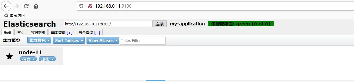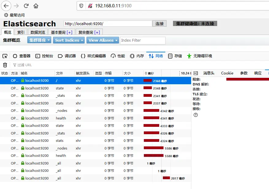 这个请求估计是获取什么状态的,但是我的请求为什么是localhost呢?我用他的方式请求了这个地址:http://192.168.0.11:9200/_cluster/state 发现没有报错,一看他连接按钮的地址栏中,请求的是他的ip,而我的是localhost,尝试改为我的ip后,绿了!集群健康值正常