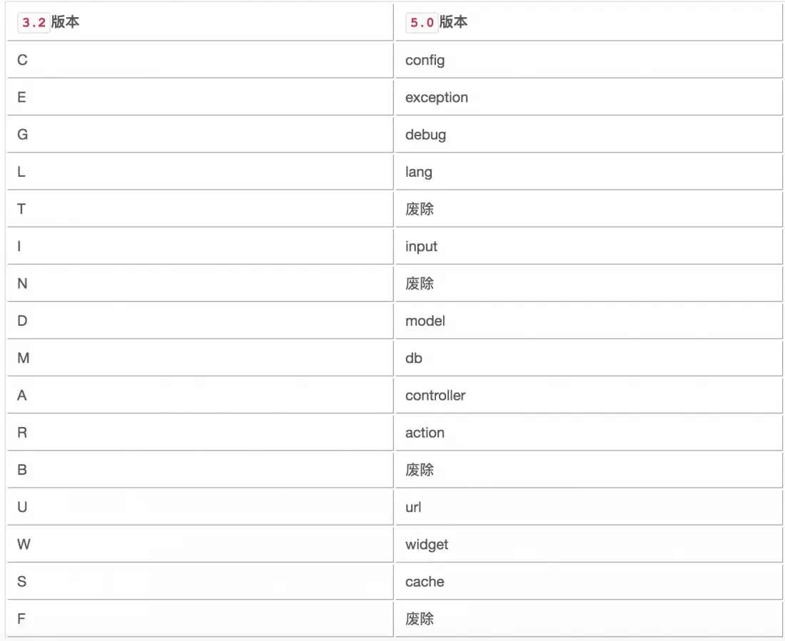 - 单字母函数废弃,默认系统加载助手函数;