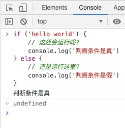 我们能发现这种情况下,实际运行的是if-block,这是因为字符串hello world为真值(五渣注:因为js会进行‘隐式转换’)。