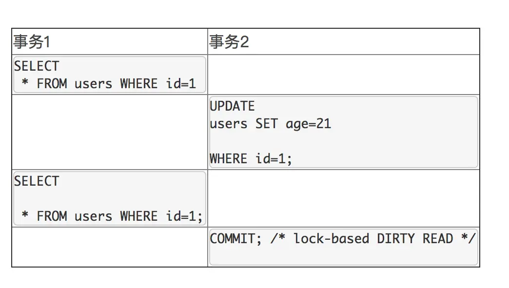 脏读发生在一个事务A读取了被另一个事务B修改,但是还未提交的数据。假如B回退,则事务A读取的是无效的数据。这跟不可重复读类似,但是第二个事务不需要执行提交。