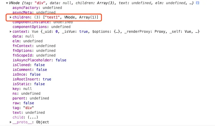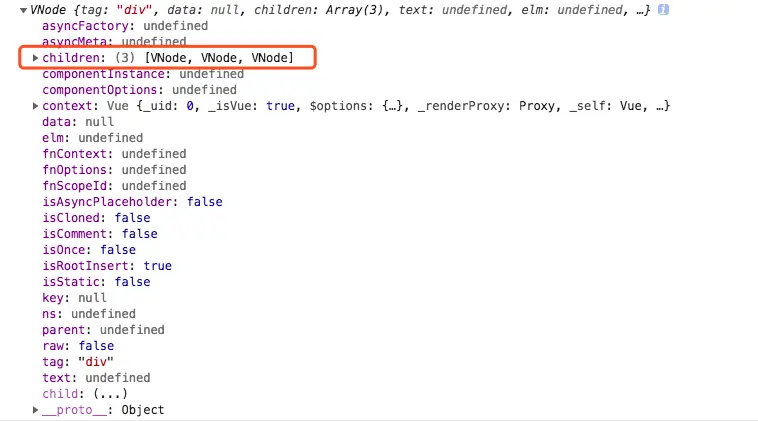 结果如下图,可以看到,children 数组被打平为一个一维数组了,并且children 数组内的元素全部被转为虚拟DOM了。