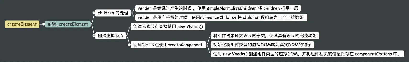 createElement对_createElement做了个封装。_createElement包含了两部分,一是children的处理,一是创建虚拟DOMchildren的处理,根据render的不同,处理方式也有所区别。- 当