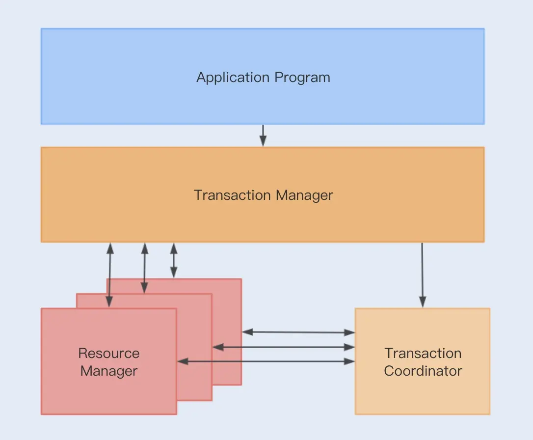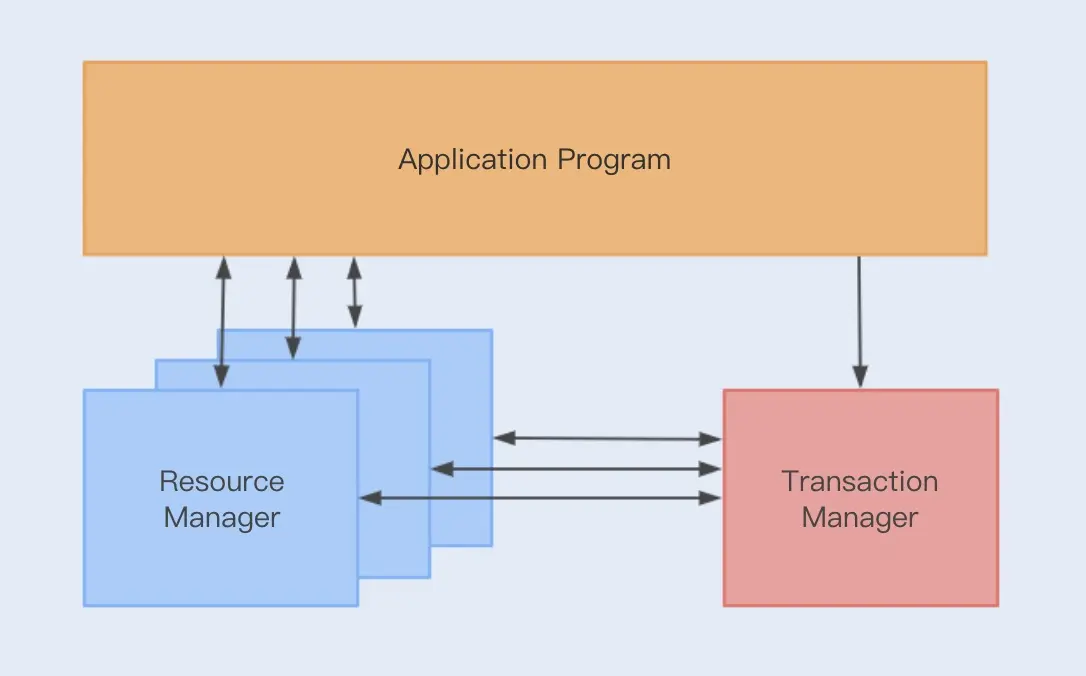 主要有三部分组成,应用程序AP,资源管理器RM,事务管理器TM。如下图所示。