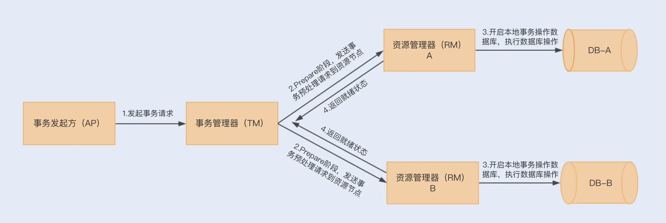 XA规范属于两阶段递交。在第一阶段,应用程序向事务管理器发送事务请求,而事务管理器会依次向每个资源管理器发送预事务请求。各个资源管理器在接收到请求后,会依次在本地打开事务,并执行相应的操作。但此时事务是没有递交的。它们会向事务管理器返回已就绪(Ready)或未就绪(Not Ready)状态。