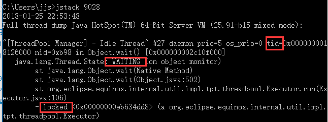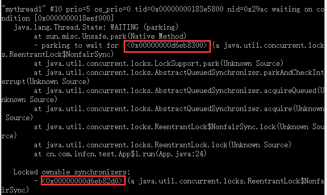 “mythread2”的堆栈信息中可以看出当前线程持有“0x00000000d6eb8300”锁,等待“0x00000000d6eb82d0”的锁。