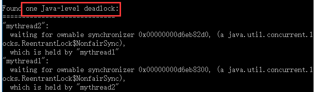 mythread1线程等待这个锁“0x00000000d6eb8300”,这个锁是由mythread2线程持有。