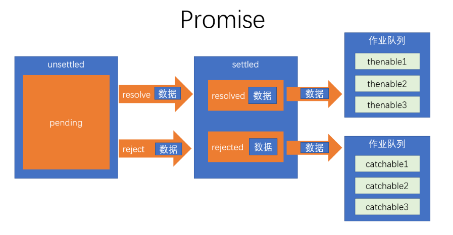 - rejected状态:这是一个非正常的已决状态,后续处理表示为catchable 后续处理可能有多个,因此会形成作业队列,这些后续处理会按照顺序,当状态到达后依次执行