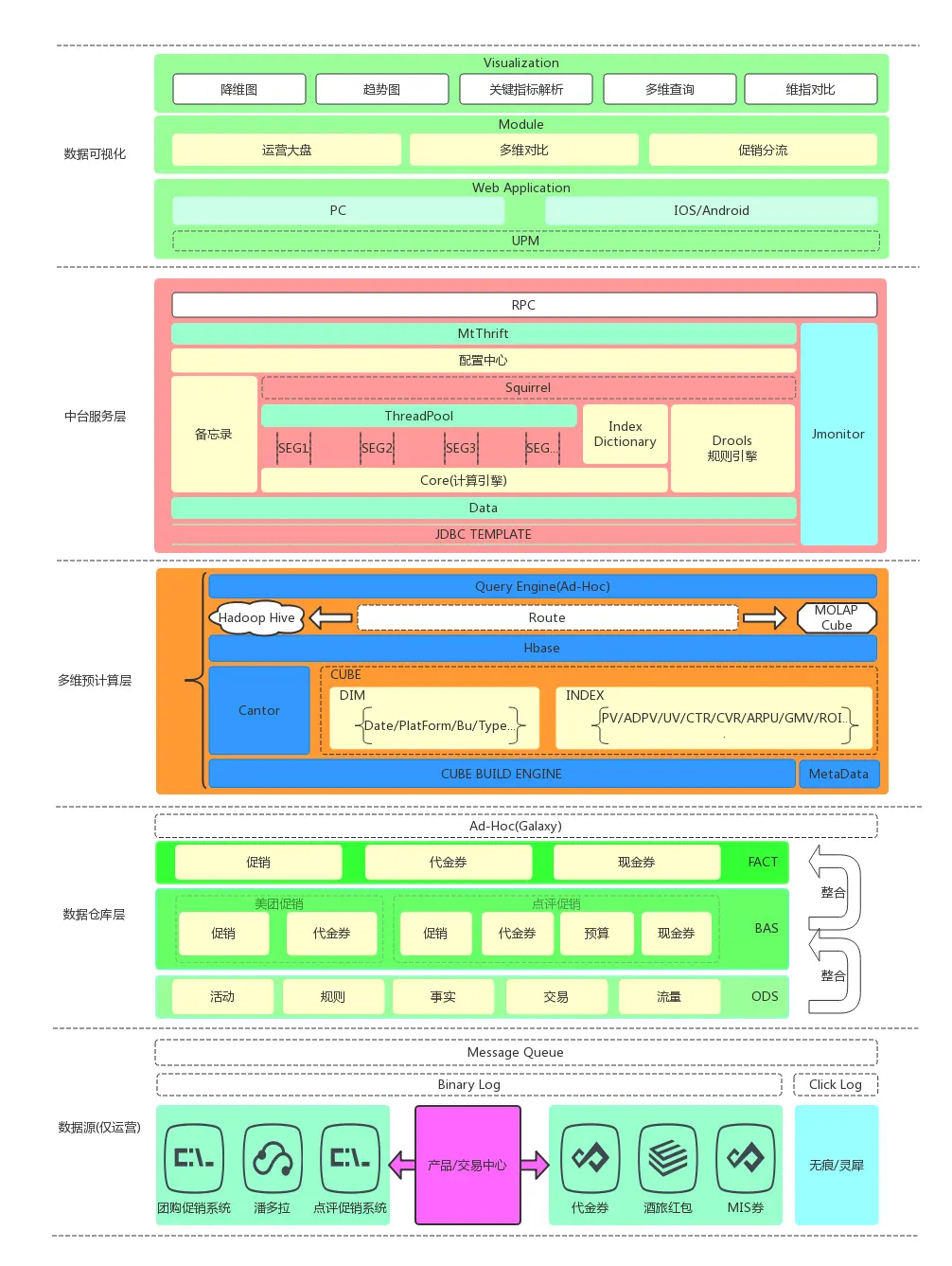 首先,构建了一个针对境内旅游运营侧全域的公共底层数据,将不同平台促销系统的数据按业务整合到一起,同时划分不同活动主题,按事件再向上聚合,做专题的数据支撑,统一数据出口。然后通过多维预计算引擎对事实数据进行预计算,构建数仓与应用的管道,从而节省计算成本,并且提升了数据互通和消费的效率,最后建设统一的数据服务中台,搭配不同端的Web应用。通过丰富的可视化效果,及多样的分析对比操作,快速、全面地支撑运营业务。