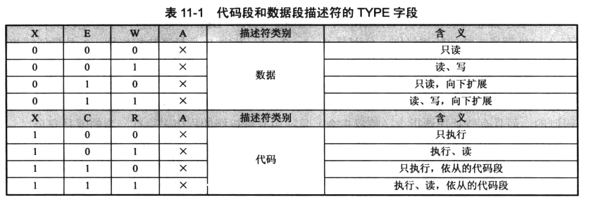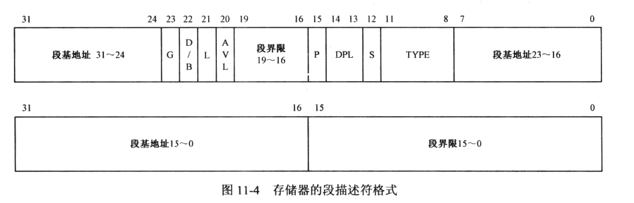 - 段基地址:总共32位,存储了该段在内存中的位置 - 段界限:声明了该段的大小 - D/B:默认操作数大小,当值为1时,默认为32位,当值为0时,默认为16位 - type字段:用于指示描述符的类别,数据段寄存器只能装载数据类型的描述符,而cs寄存器之能装载代码段的描述符type字段占据4个位,具体描述如下