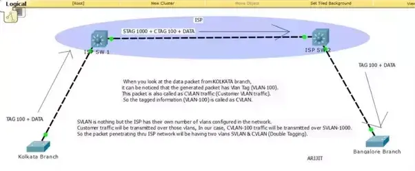 SVLAN is nothing but the ISP has their own number of vlans configured in the network. Customer traffic will be transmitted over those vlans, In our case, CVLAN-100 traffic will be transmitted over SVLAN-1000. So the packet penetrating thru ISP network will be having two vlans SVLAN & CVLAN (Double Tagging).