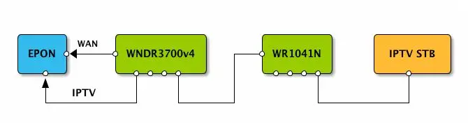 因为我们这里电信的IPTV使用PPPoE认证,所以我这样的拓朴事实上能够基本正常工作——上面提到的blog里解释了一些细节。对了,这种接法用WNDR3700v4的官方固件行不通,WAN连接会直接断了。WNDR3700v4刷DDWRT,以及原来用Linksys EA2700都可以工作。