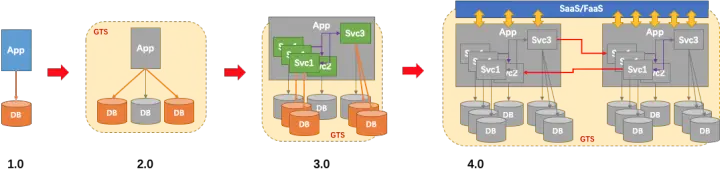 - 4.0:跨应用的整合,成为 SaaS 或 FaaS 的平台,在更大的范围,产生分布式事务问题。