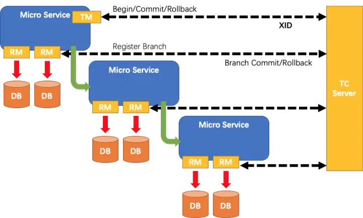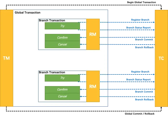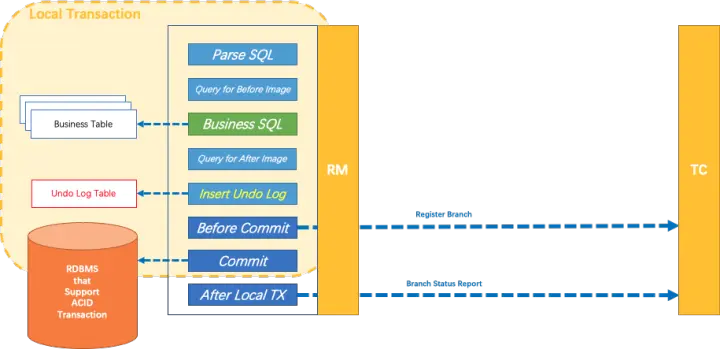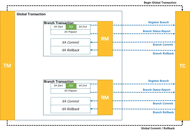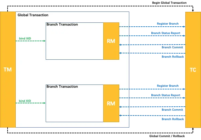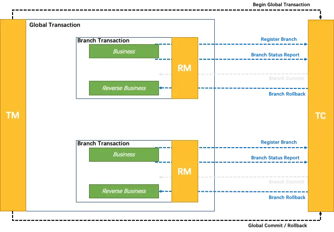 - Resource Manager (RM): 控制分支事务,负责分支注册、状态汇报,并接收事务协调器的指令,驱动分支(本地)事务的提交和回滚。