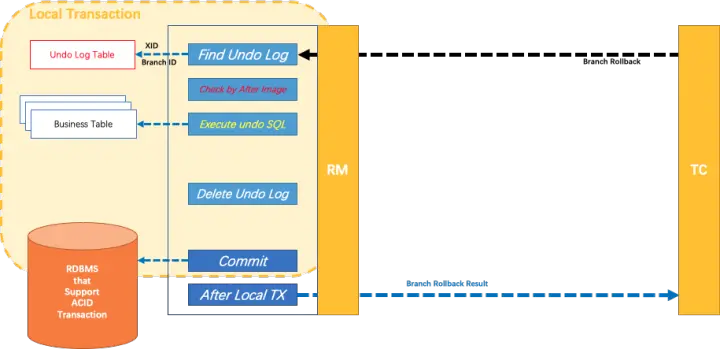 - 如果 TM 发出的决议是全局回滚,RM 收到协调器发来的回滚请求,通过 XID 和 Branch ID 找到相应的回滚日志记录,通过回滚记录生成反向的更新 SQL 并执行,以完成分支的回滚。