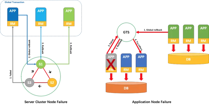 最后,GTS 通过事务协调器集群以及对业务应用节点的容错,实现一个拒绝单点故障的高可用服务。