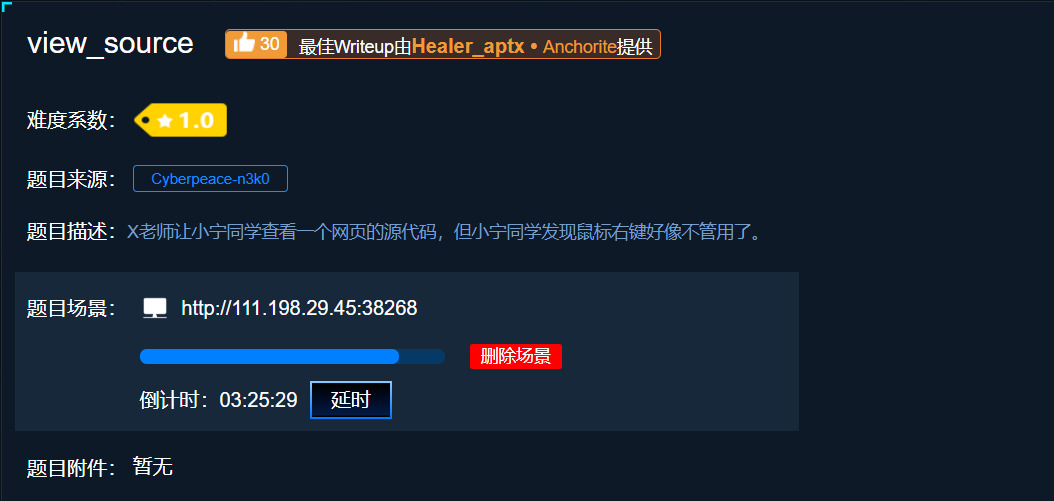 从题目就能看到提示,是需要我们去查看源代码的,但是页面点击右键没反应。