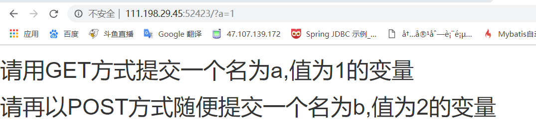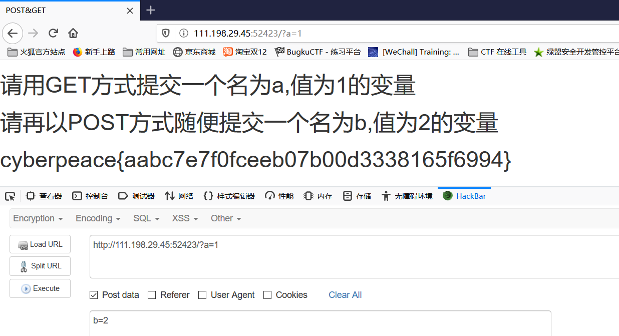 请再以POST方式提交一个参数名为b值为2的参数。因为POST的参数是在请求体中的,可以通过火狐的插件hackbar直接构造请求,就能得到flag。(Tips:可以用burpsuite抓包来改,也能用Postman等请求发起工具去构造请求,火狐的插件会比较方便一些。)
