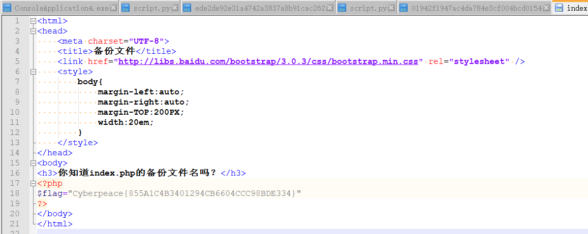 .bak,URL后面加上?index.php.bak就能下载到一份index.php.bak文件。用文本工具打开就能看到flag。