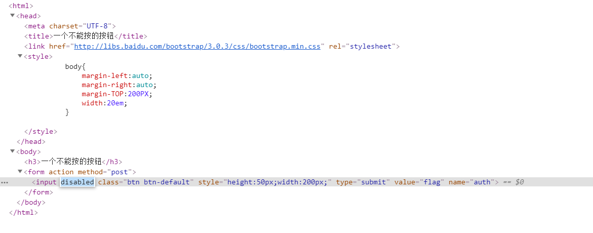disabled_button,应该是这个button的属性中被设置了disabled导致按不了。这种其实可以通过浏览器的F12控制台更改标签属性,从而在前端进行绕过。除了disabled外,一些输入长度限制等都可以通过修改来绕过。