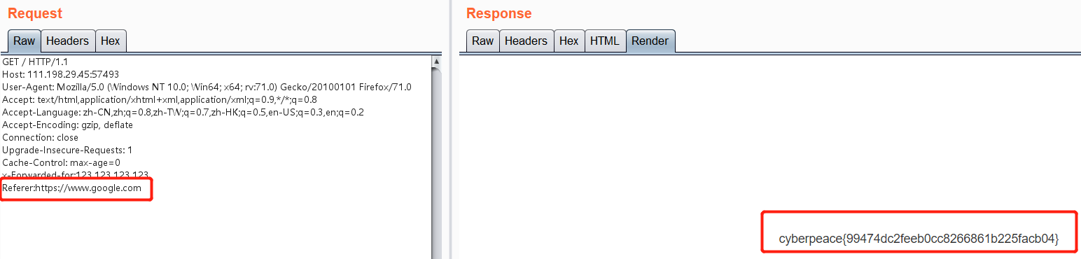 必须来自https://google.com,也就是我们还要抓包改Referer:https://www.google.com,就能在页面中看到flag。