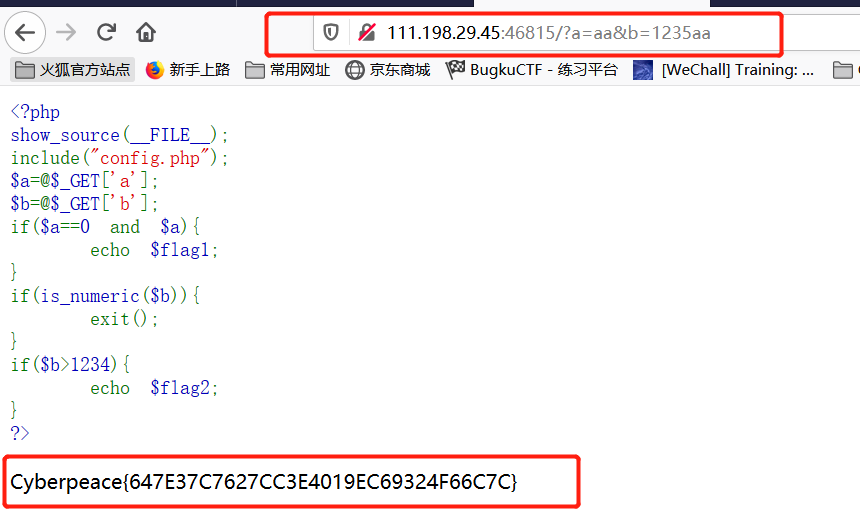 aa。b不能是数值型,且转换为数值型后要大于1234,那也很简单直接填1235a。输入后就能发现flag,这题其实考的是弱语言类型PHP的类型转换。