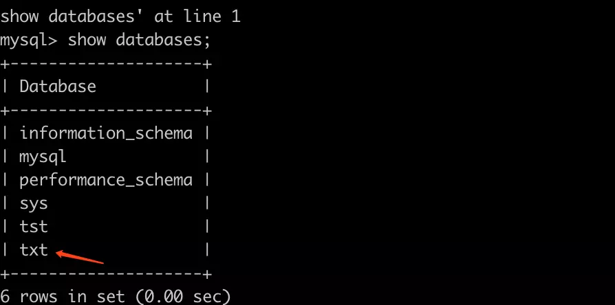 第五步:show databases; //查看数据库 通过这条命令我们可以看到刚刚添加的库‘txt’如下: