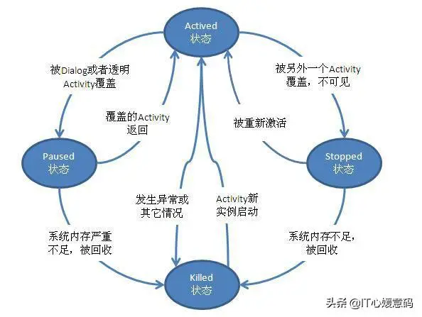 当Activity被系统回收掉时,Activity就处于Killed状态。如果一个Activity是Paused或者Stopped状态,系统可以将该Activity从内存中删除,Android系统采用两种方式进行删除,要么要求该Activity结束,要么直接终止它的进程。当该Activity再次显示给用户时,它必须重新开始和重置前面的状态。