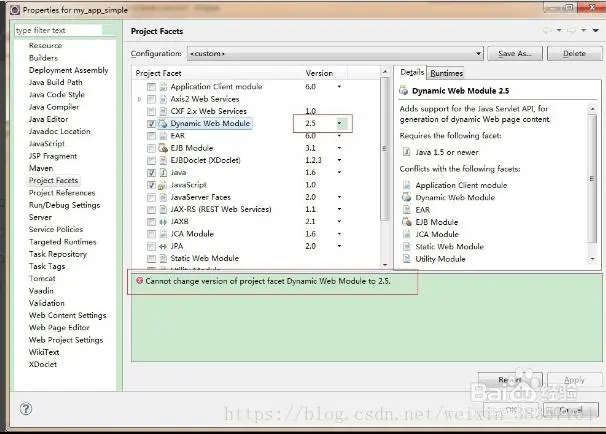 Maven项目在Project Facets里面修改Dynamic web module为2.5的时候就会出现Cannot change version of project facet Dynamic web module to 2.5 的错误,如图: