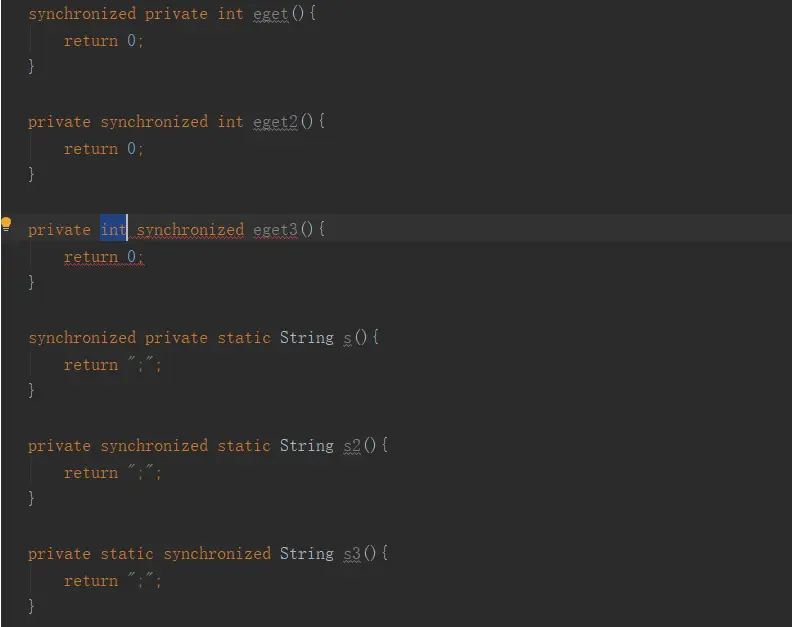 其作用在方法上的写法如下图,synchronized只要放在返回类型前面就行。