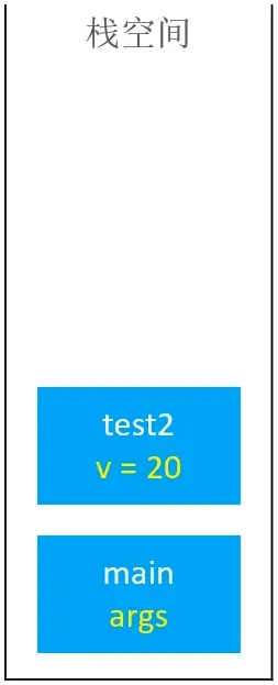 - 接下来,main函数会继续调用test2(20)函数,调用test2(20)函数,系统又会为test2函数分配一段连续的栈空间,用来保存test2函数中的参数,所以调用test2函数以后,内存中的结构如下