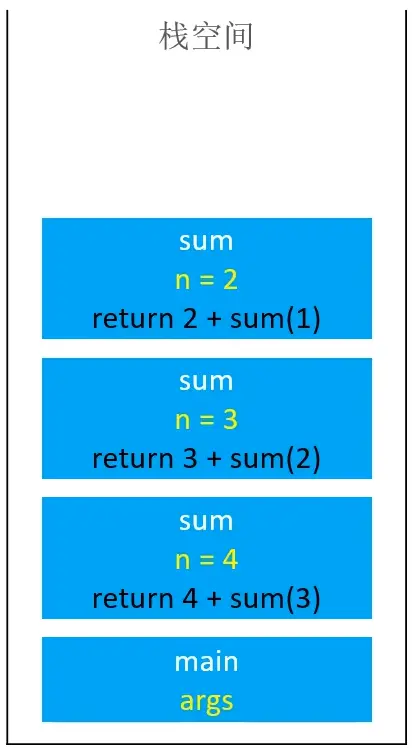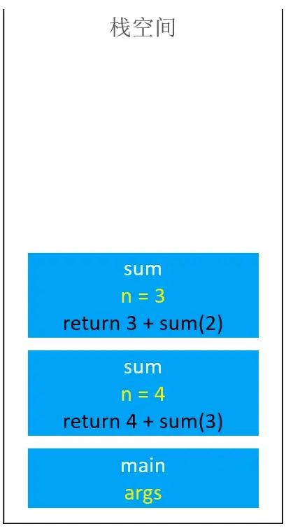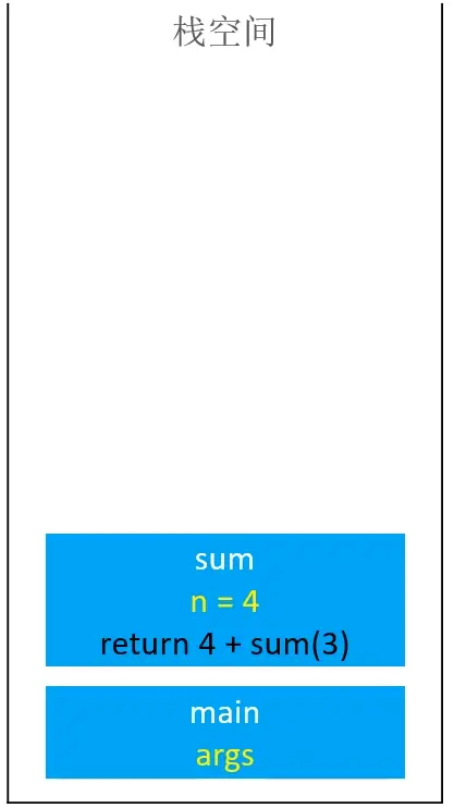 - 由于在main函数中传入的参数是4,所以在sum函数内部,又会调用sum(4 - 1)即sum(3),所以又会为sum函数开辟一段连续的栈空间,push到栈空间中,需要注意,这一次调用sum函数传入的参数是3,所以最终的内存结构如下
